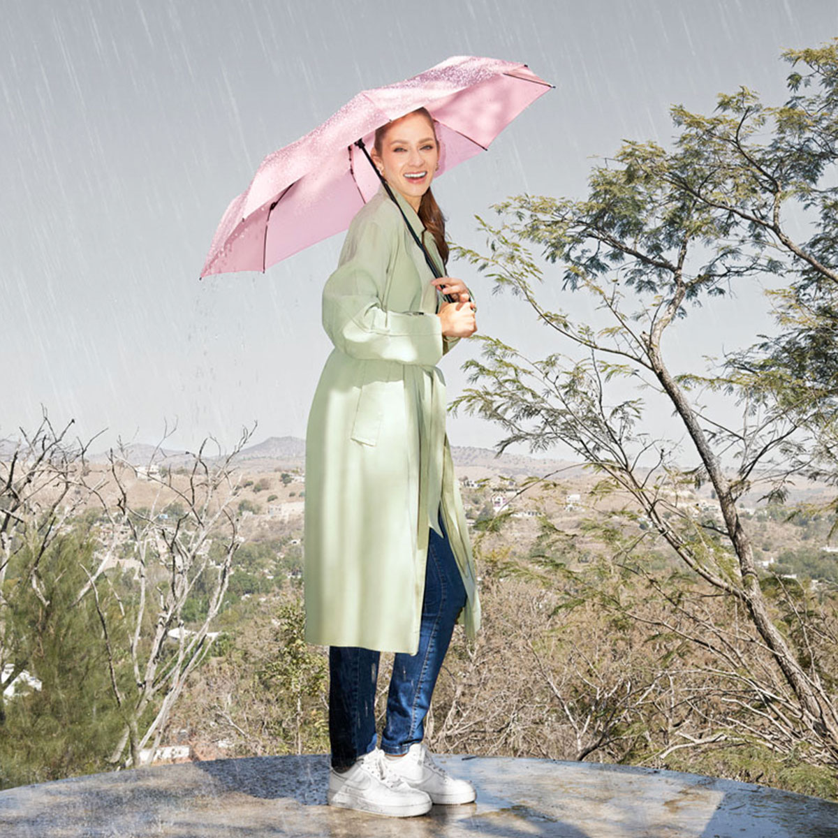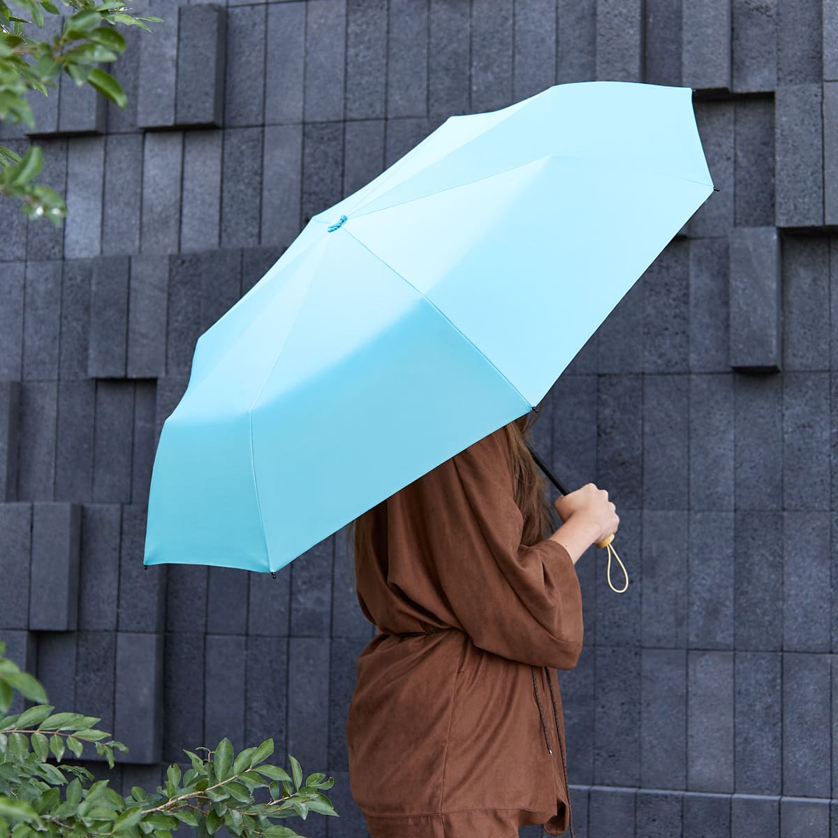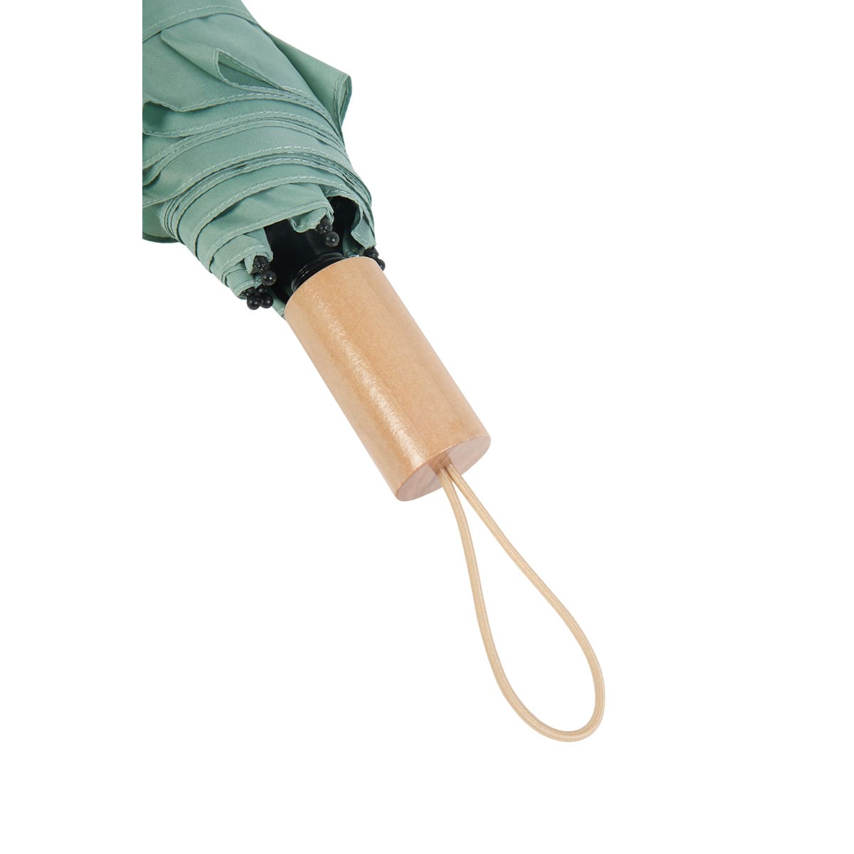 Paraguas de bolsillo de 8 paneles. Sistema de abertura manual. Mango de madera con asa elastica. Incluye funda individual con boton metalico que permite abrir y guardar el paraguas facilmente.