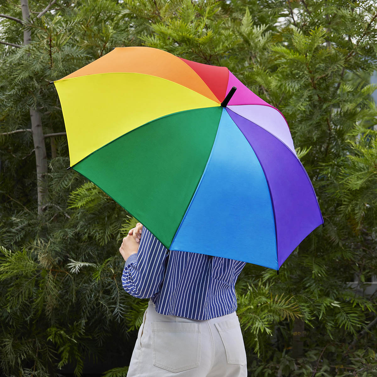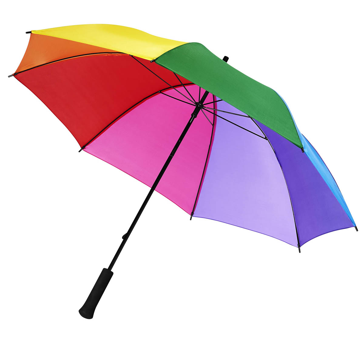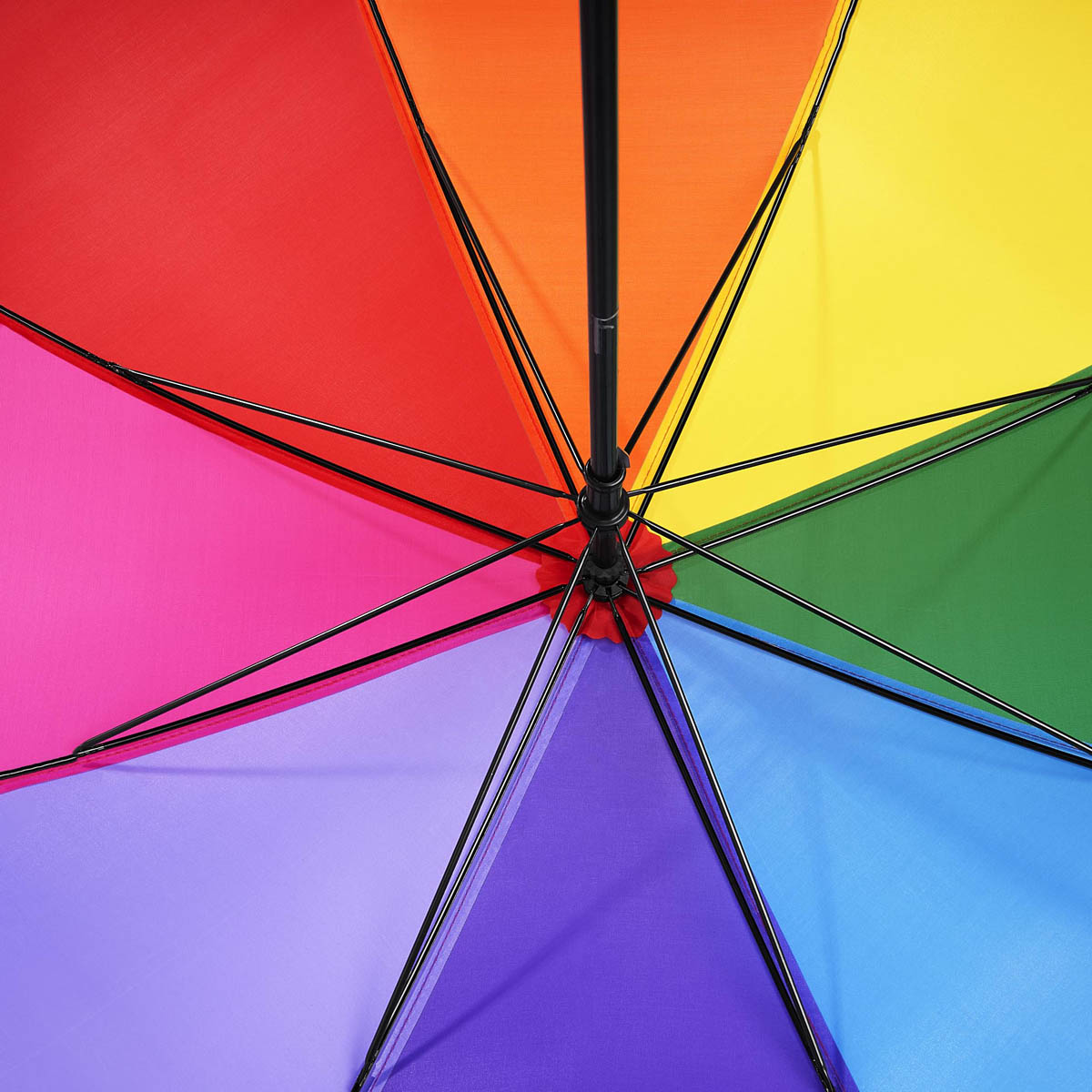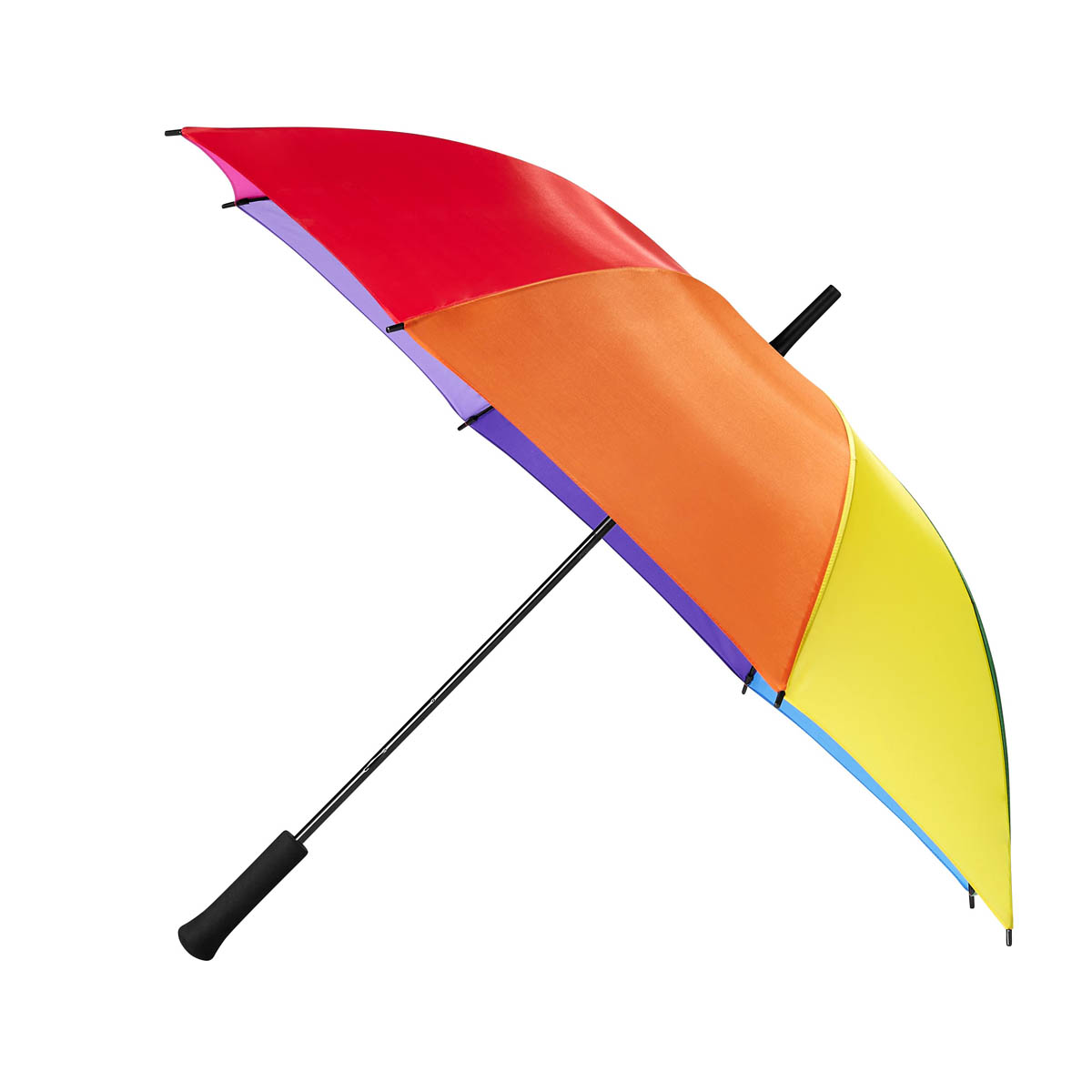 Paraguas de 8 paneles, cada panel de un color. Sistema manual. Mango de esponja. Su diseno arcoiris, colorido y alegre refleja la diversidad y la inclusividad.
