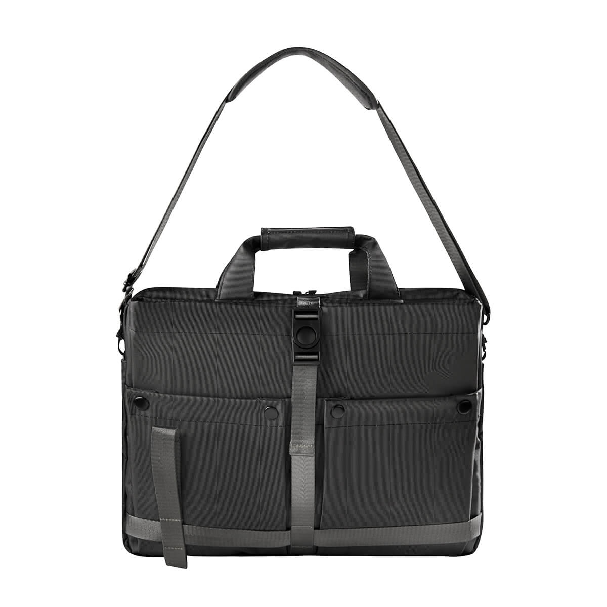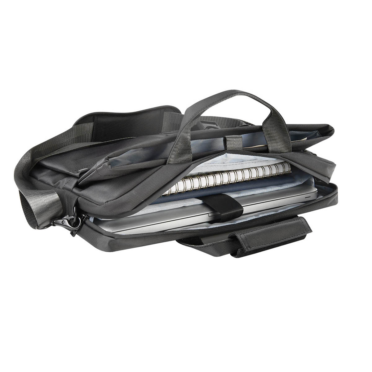 Portafolio ejecutivo con multiples bolsillos organizadores, ideal para llevar todo lo necesario en un solo accesorio. Su bolsillo principal con cierre, permite guardar una laptop de hasta 15''. Bolsillo frontal, con cierre de velcro y broche de plastico, ideal para mantener seguras tus pertenencias de valor, ademas de dos bolsillos para objetos mas pequenos. Asa superior que se une por medio de velcro y un asa removible para hombro con broches metalicos. En la parte posterior, contiene una banda para transportar facilmente en trolley.