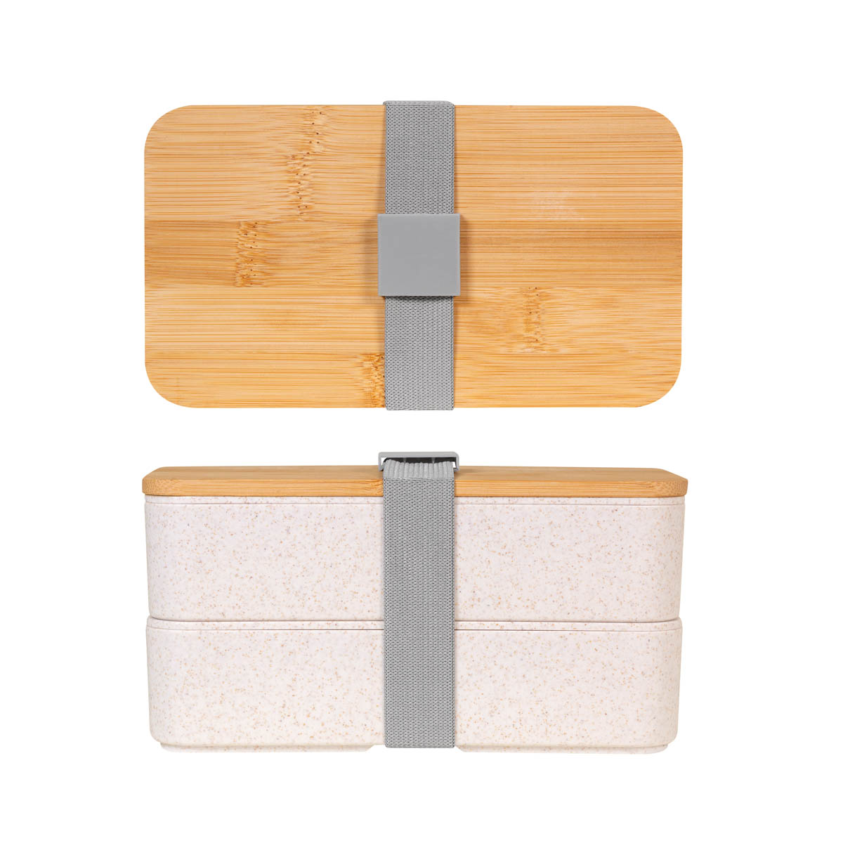 Contenedor de alimentos con doble compartimento. Capacidad total de 1 litro. Incluye tenedor, cuchillo y cuchara. Su fabricacion lo hace amigable con el medio ambiente, al incorporar fibra de Trigo en sus materiales. La elegante Tapa de bambu asegura tus alimentos y la banda elastica mantiene todo firmemente cerrado. Practico y versatil, este set es apto para lavavajillas y microondas, excluyendo la Tapa de bambu. La madera es un producto natural el cual puede presentar variaciones en tonalidades y vetas.