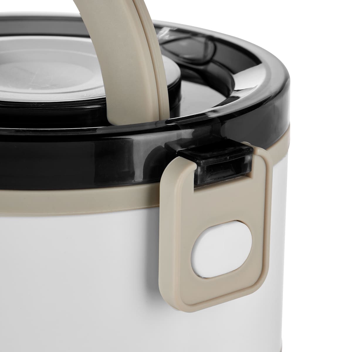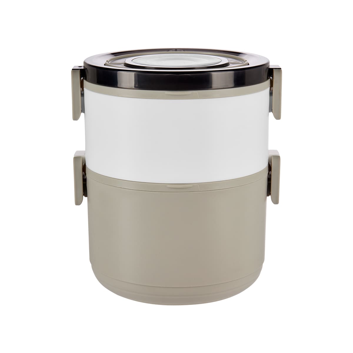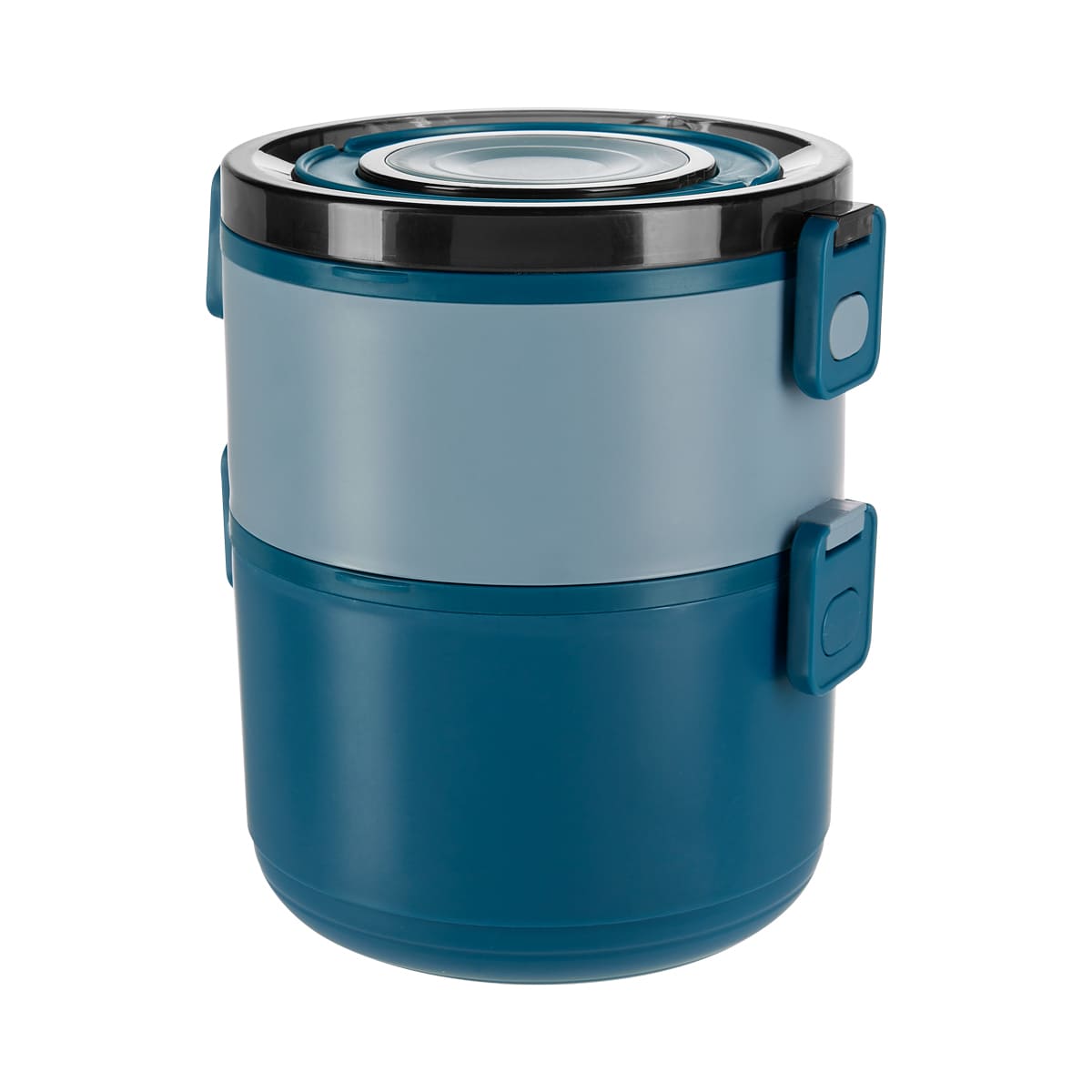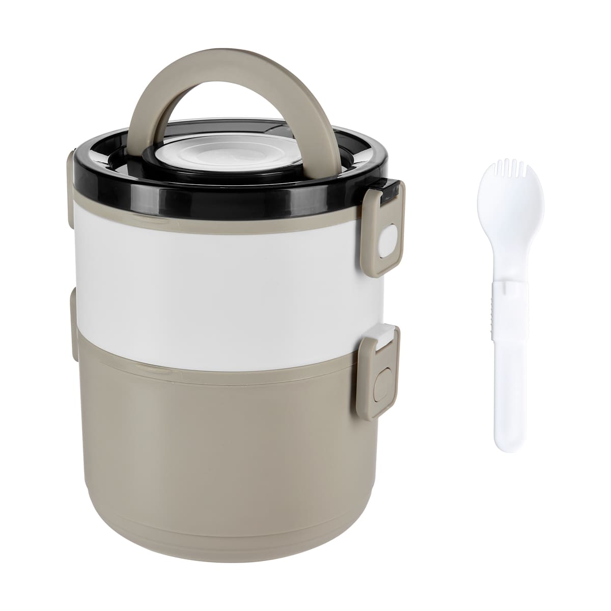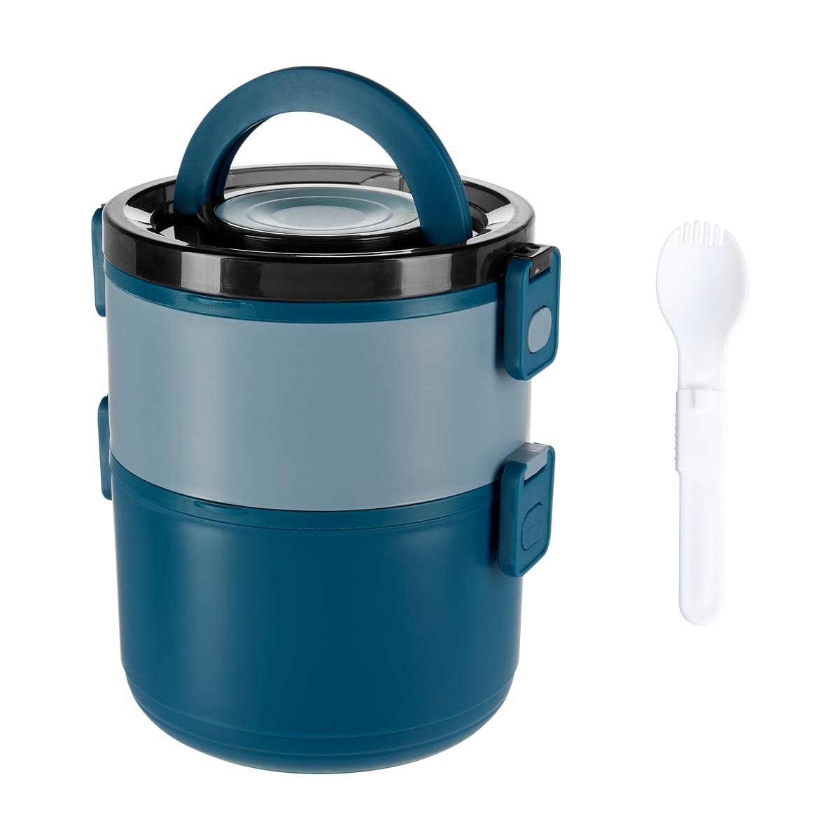 Contenedor de alimentos con dos pisos independientes que permite separar tus alimentos y no mezclar sabores. Fabricado con una pared sencilla de plastico, ideal para el uso de microondas. Cada compartimento cuenta con su tapa hermetica para evitar derrames y sus broches laterales ayudan unir o separar cada elemento. Incluye cuchara de plastico, tapa con asa plegable y caja individual. Apto para el uso en microondas y lavavajillas.