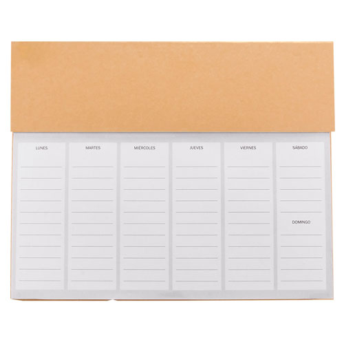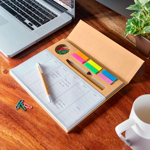 Programador semanal con 100 hojas. Incluye boligrafo ecologico, clips y banderillas adheribles de 6 colores.