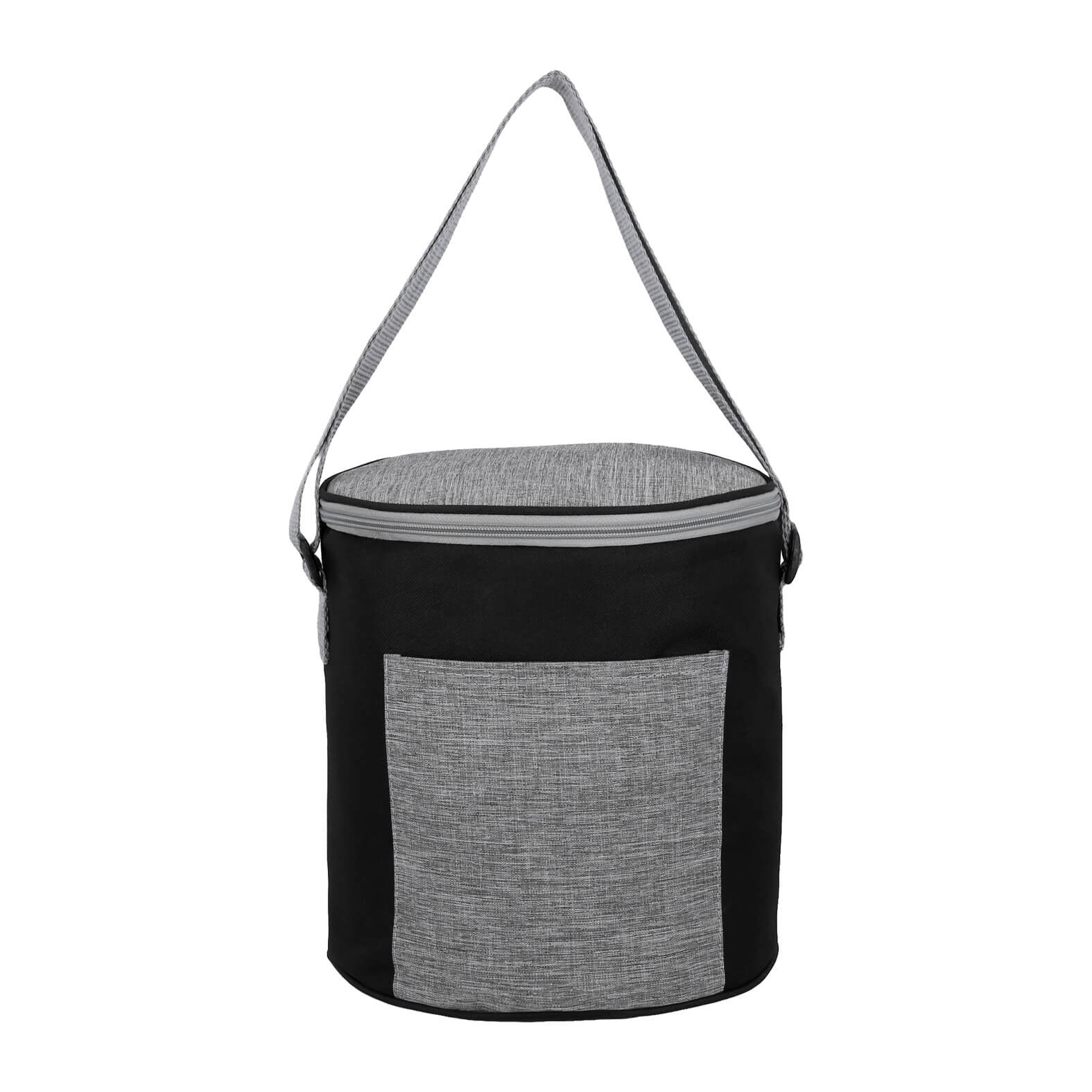 Hielera circular de poliéster con interior plástificado, bolsa frontal y correa ajustable.