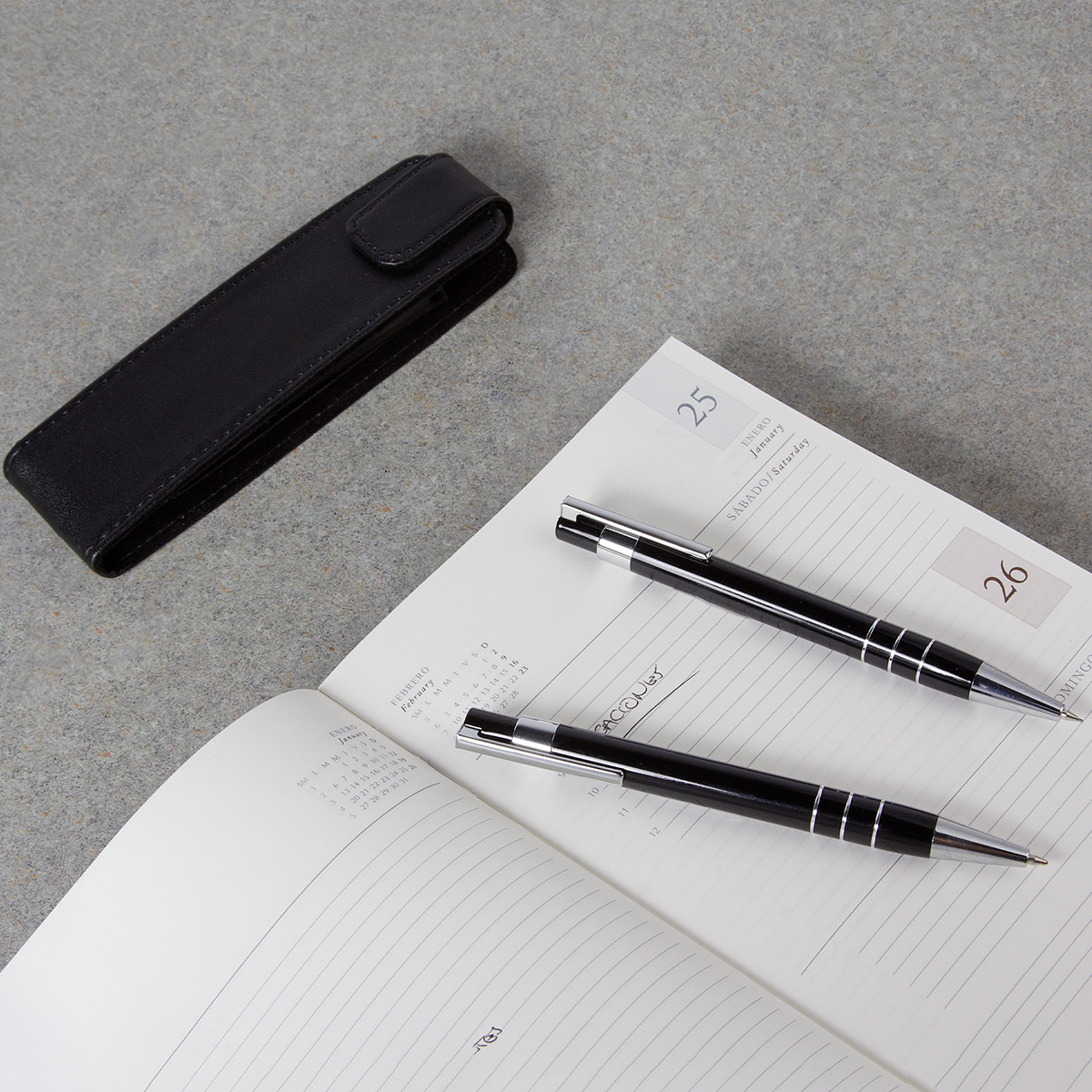 Boligrafo y lapicera 0.5 mm. Mecanismo pulsador. Incluye estuche con iman para cerrado.