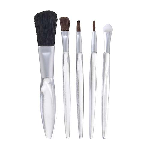 Set con 1 brocha para rubor, 1 aplicador de sombra, 1 brocha para sombra, 1 brocha delineador, 1 brocha para labios y estuche.