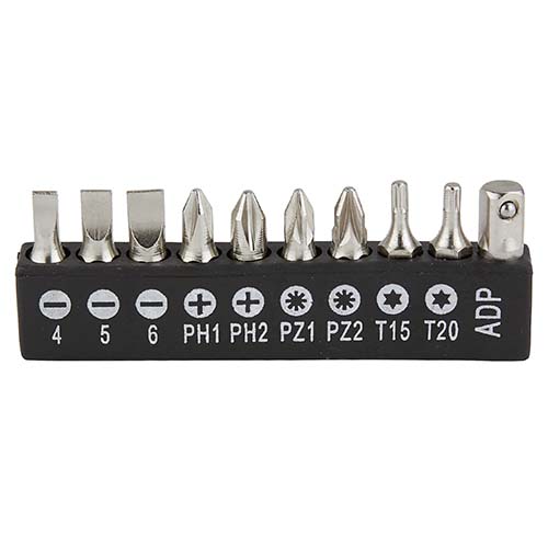 Contiene desarmador y 10 puntas diferentes e intercambiables, 5 llaves hexagonales, dado extension, 4 dados y pinzas de punta. Incluye estuche.