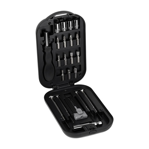 Contiene cuter, 4 desarmadores de relojero, dado extension, 4 dados, desarmador con 10 puntas diferentes e intercambiables. Incluye estuche.