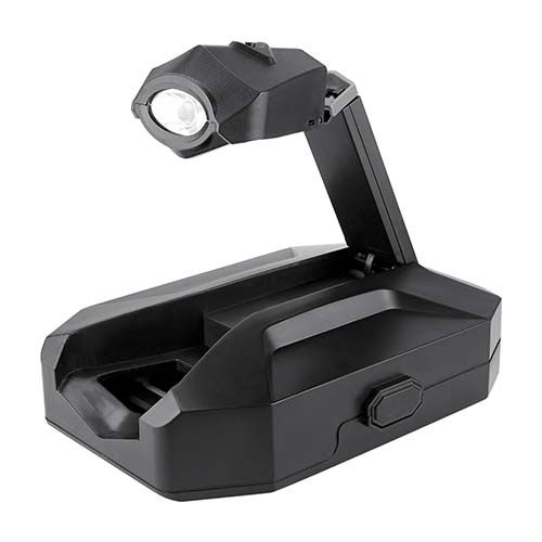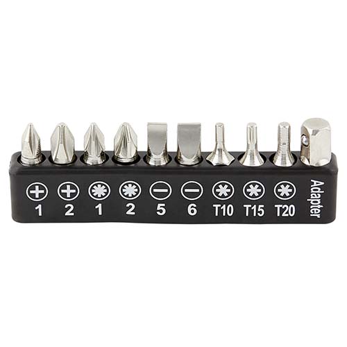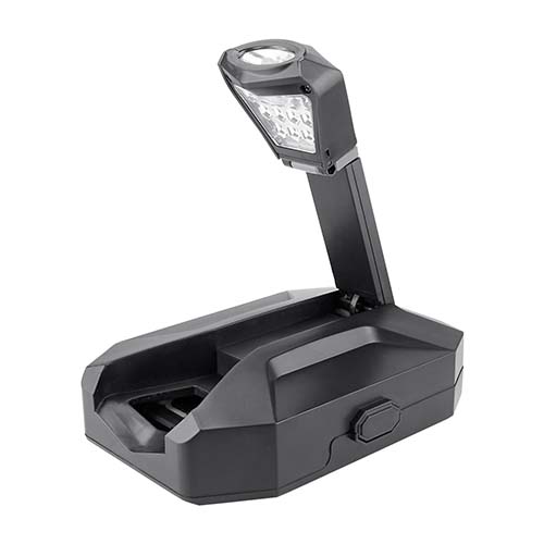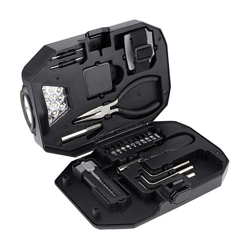 Contiene 2 desarmadores relojeros con 4 puntas distintas, dado extension, desarmador con 10 puntas diferentes e intercambiables, 3 llaves hexagonales, pinzas de punta, flexometro de 1m, cuter, lampara desmontable con 13 LEDS, utiliza 3 baterias AAA (no incluidas) y correa ajustable con adaptador para lampara. Incluye estuche.