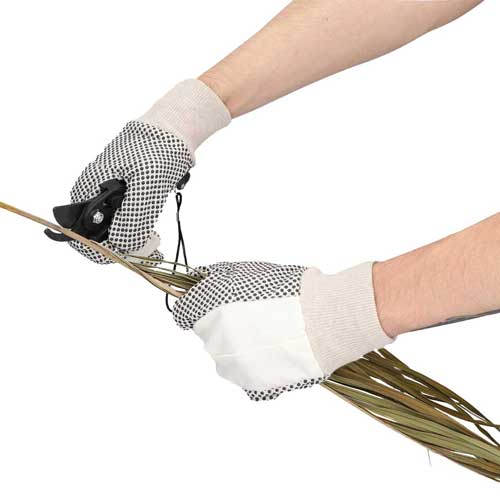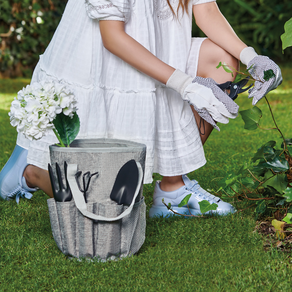 Set de jardin que incluye pinzas de corte, pala ancha, horqueta, rastrillo, guantes de algodon con antiderrapante y bolsa con asa.