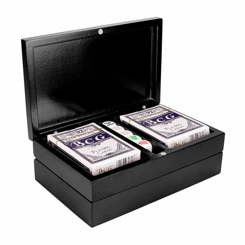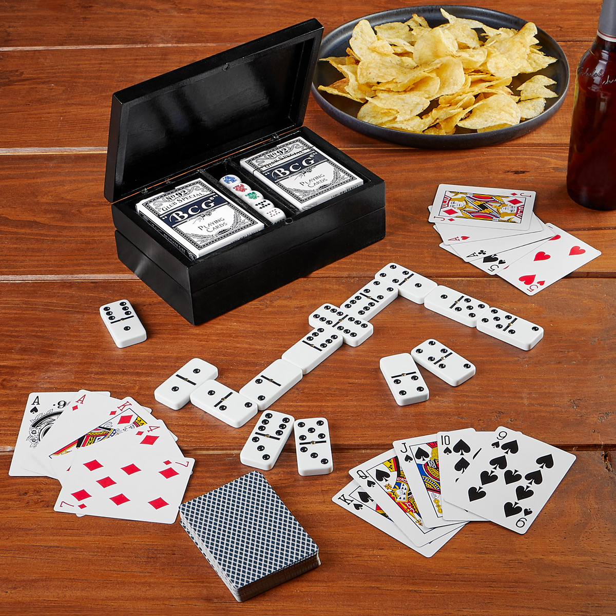 Incluye estuche de madera con 5 dados, 2 barajas plastificadas y domino de 28 piezas.
