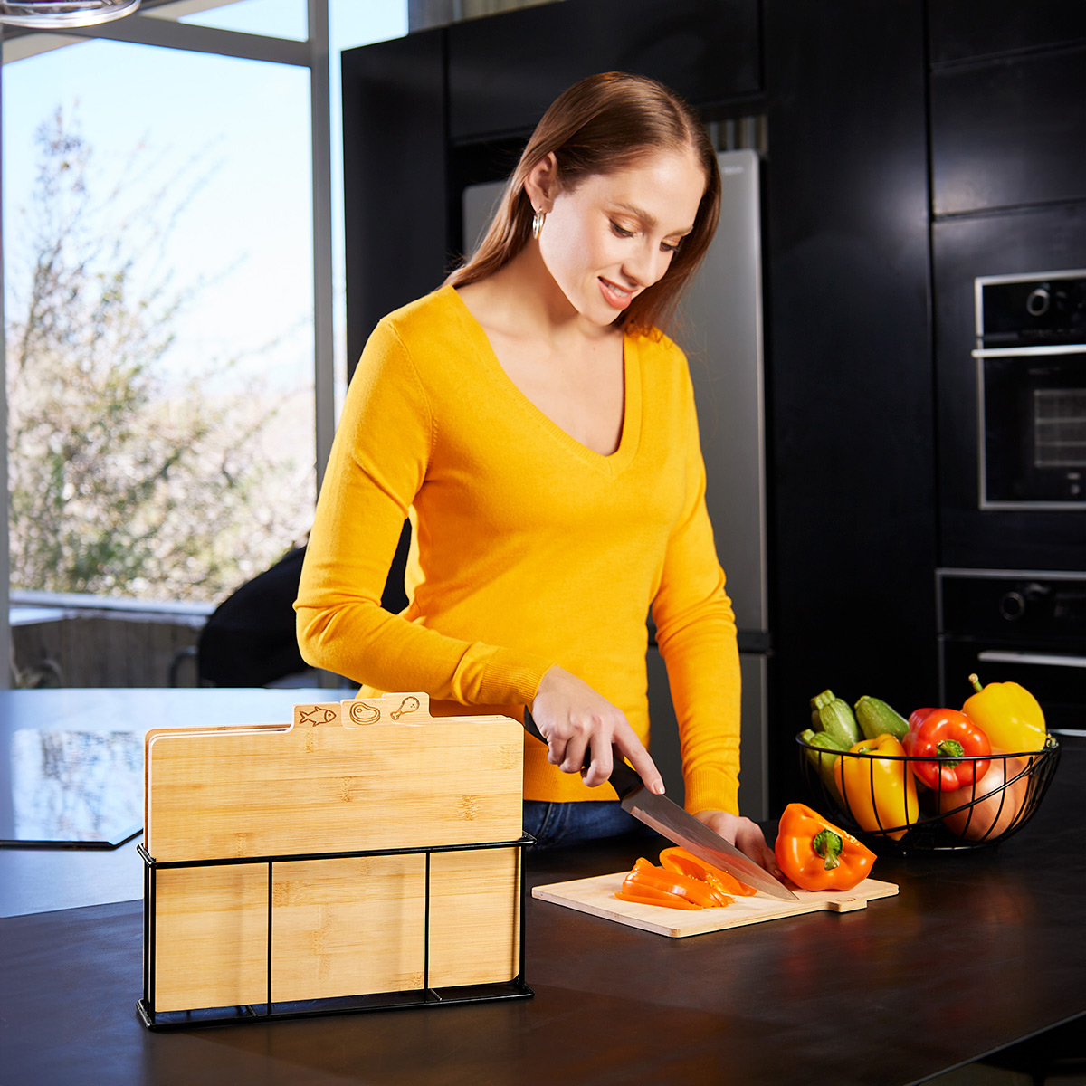 Juego de tablas de bambu para cocina con soporte metalico. Incluye tabla para cortar pollo, carnes rojas, pescado y verduras. Incluye caja individual. La madera es un producto natural el cual puede presentar variaciones en tonalidades y vetas.