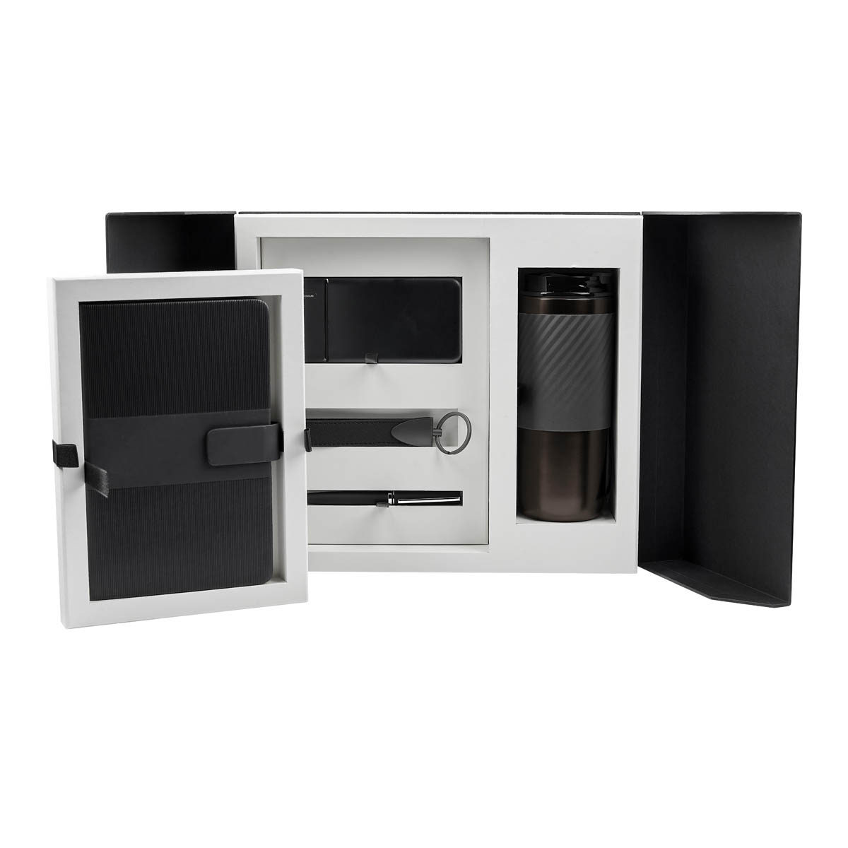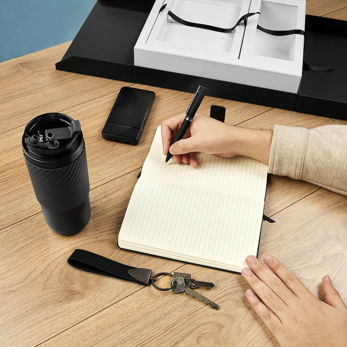 Exclusivo set de regalo. Opcion perfecta para un obsequio de alto valor y calidad. Este set viene en una elegante caja negra con solapa de abertura central, lo que no solo proporciona un acceso facil al contenido, sino que tambien anade un toque sofisticado al diseno. El interior de la caja presenta un color neutro que realza el aspecto general, creando un hermoso contraste con el exterior negro. Incluye termo con doble pared metalica, cerrado al vacio, tapa con sistema de rosca, sobretapa de push y ranura especial con tapon para popote, tambien incluye popote metalico con boquilla de silicon. Libreta de 80 hojas de raya, cubierta rigida de curpiel, separador interno y broche magnetico. Boligrafo metalico con sistema twist y terminado rubber. Llavero metalico combinado con curpiel, aro con giro de 360°. Bateria auxiliar para smartphone de 10,000 mAh, incluye 2 puertos USB, 1 micro USB y 4 LEDs indicadores de carga.