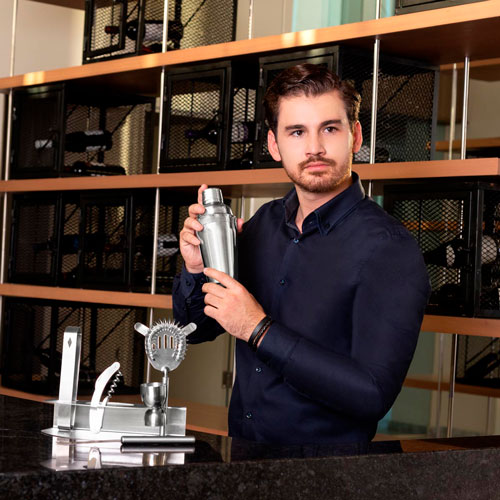Set para preparacion de bebidas con base. Incluye shaker, pinzas, dosificador, colador, cuchillo, sacacorchos con navaja y destapador.