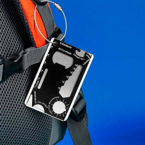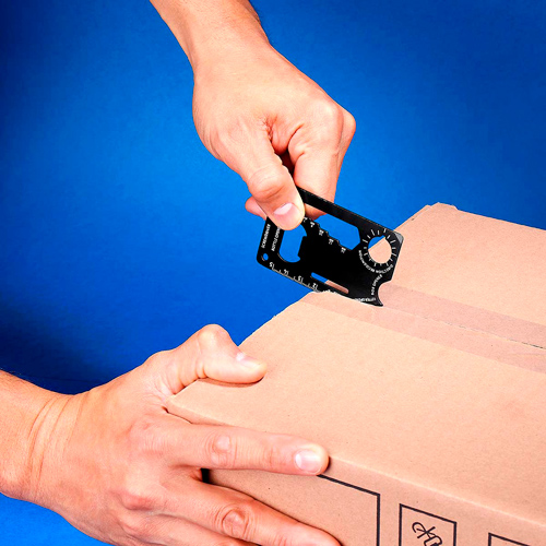 Tarjeta multiherramientas con funcion de desarmador, abrecartas, abrelatas, destapador, llave inglesa, regla y pelador. Incluye aro para llavero.