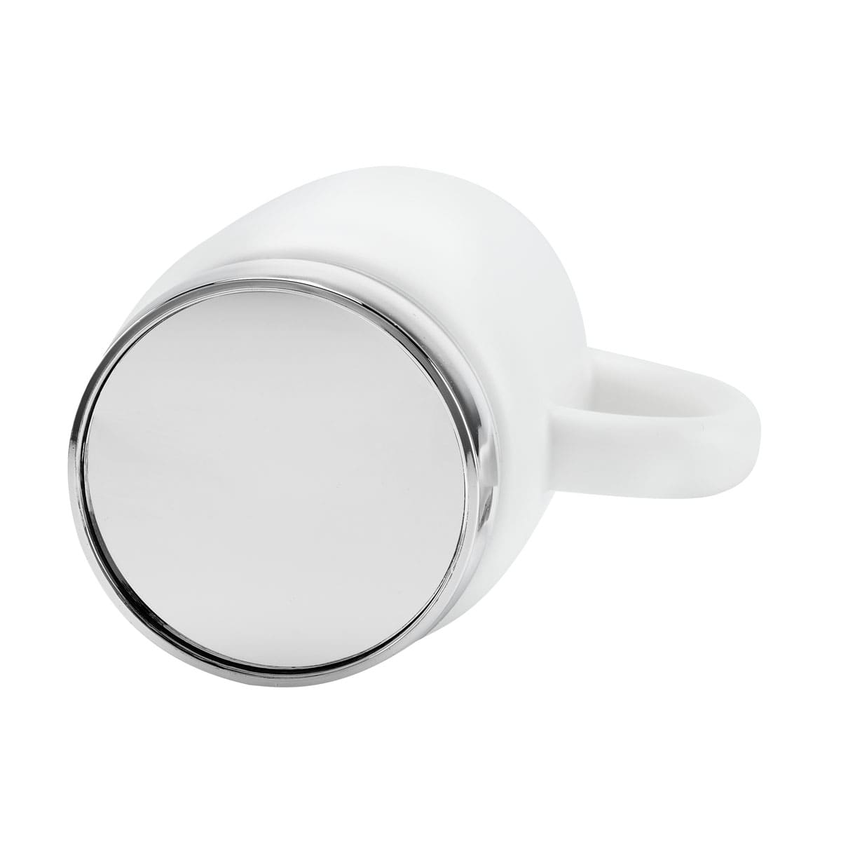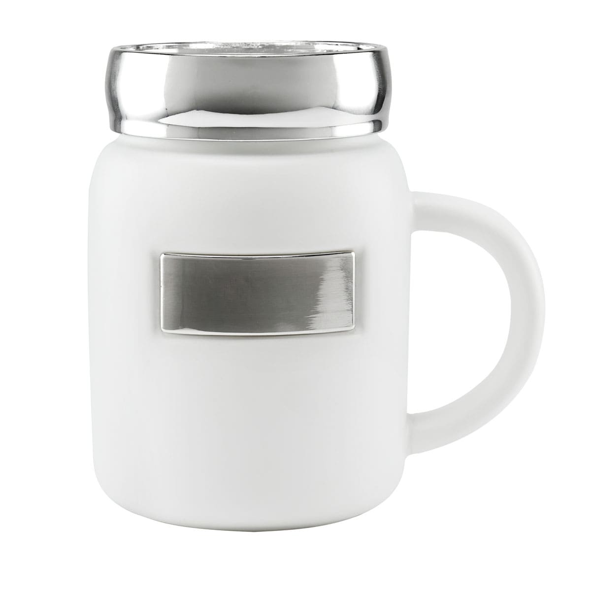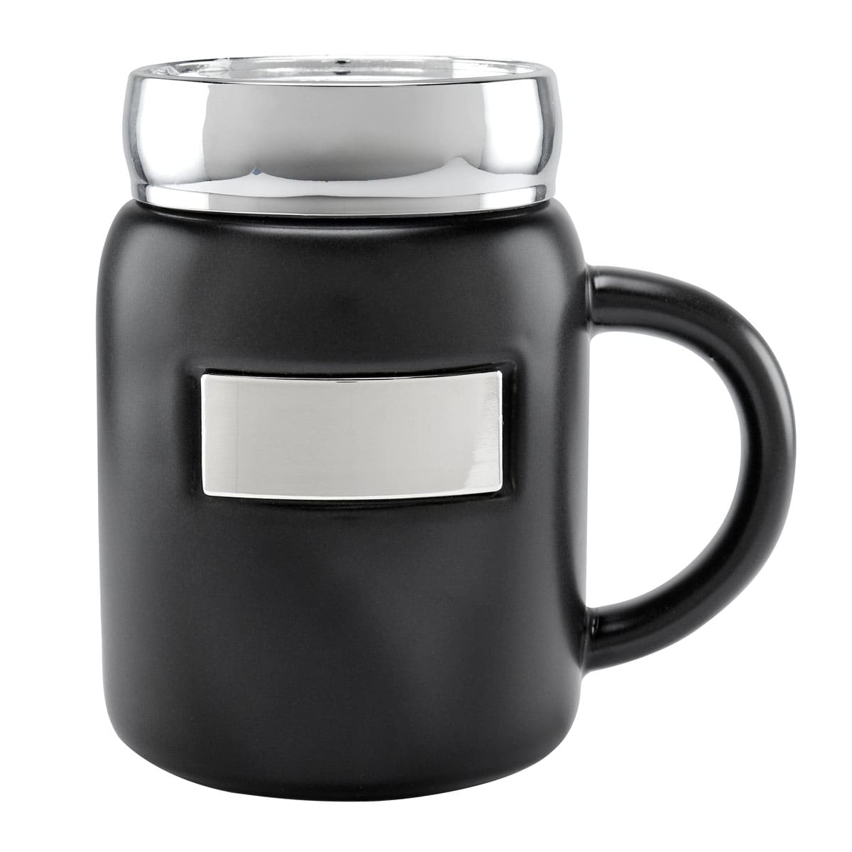 Taza tarro de ceramica con placa metalica para impresion. Tapa de rosca de plastico con recubrimiento metalizado. Terminado mate. Incluye caja individual.