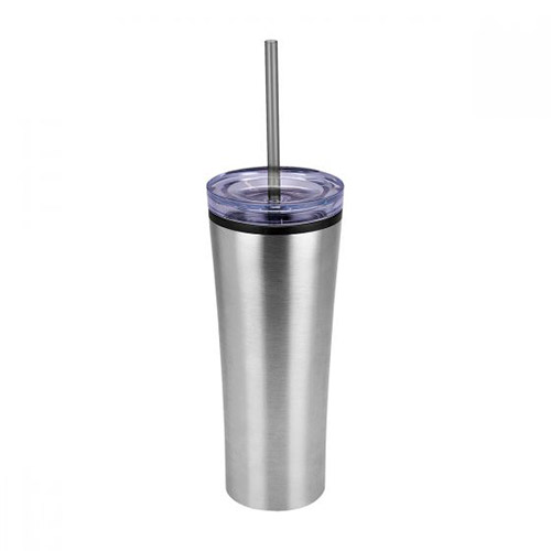 Doble pared. Pared interna plastico, pared externa acero inoxidable. Tapa y popote de plastico. Incluye caja individual.