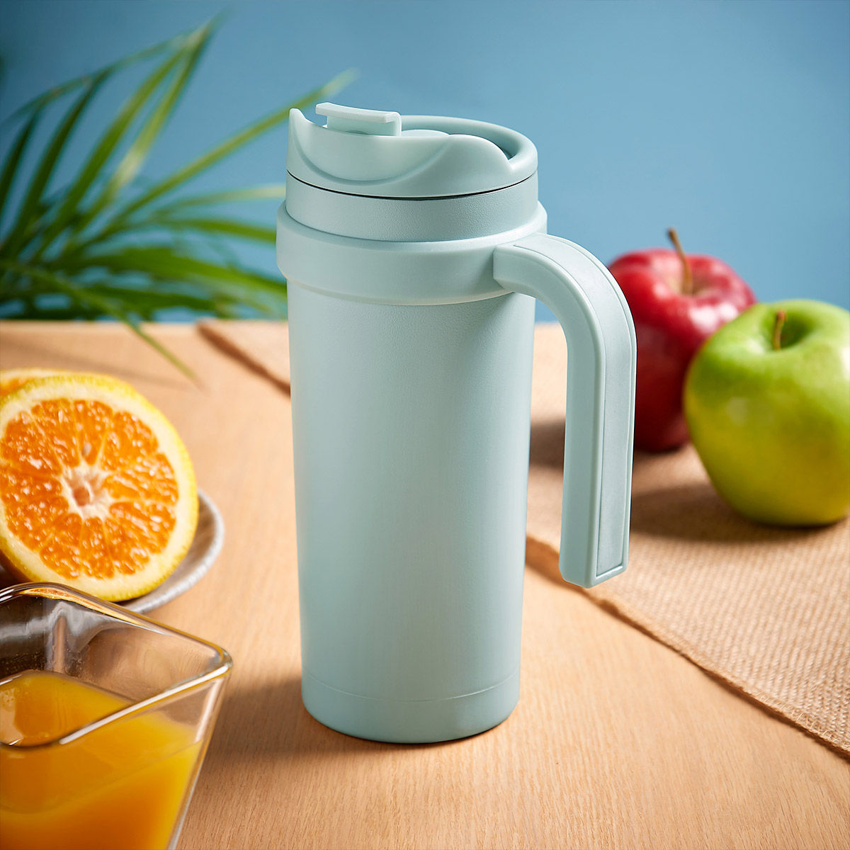 Doble pared. Cerrado al vacio. Pared interna y externa de acero inoxidable. Tapa de plastico con cierre de rosca y sobretapa de push. Asa de plastico. Mantiene temperatura caliente 6 hrs y fria 12 hrs. Incluye caja individual.