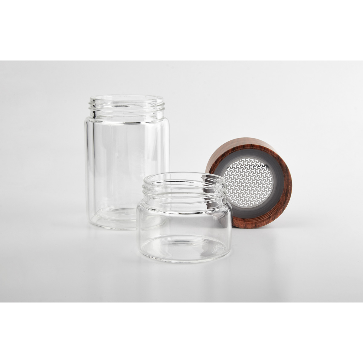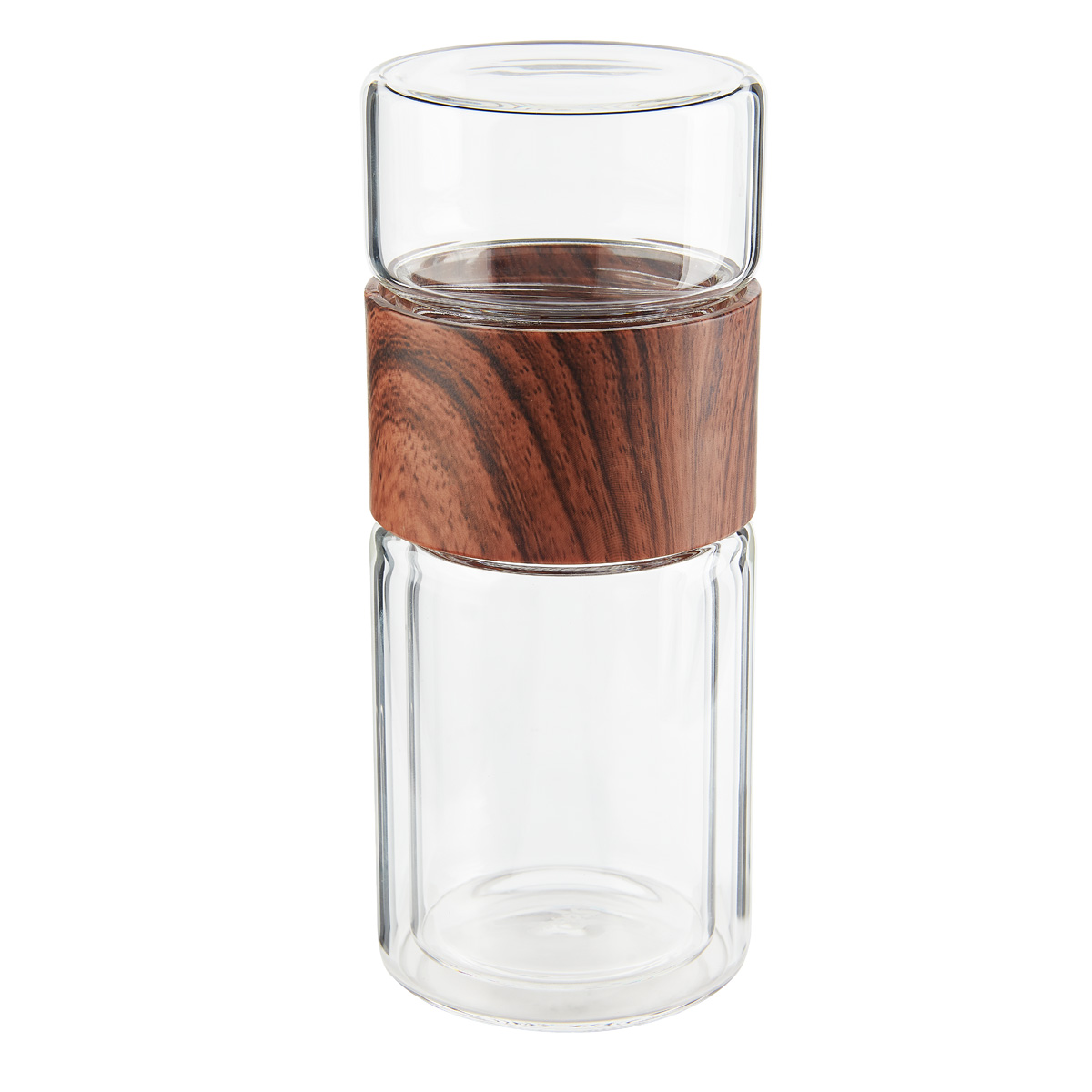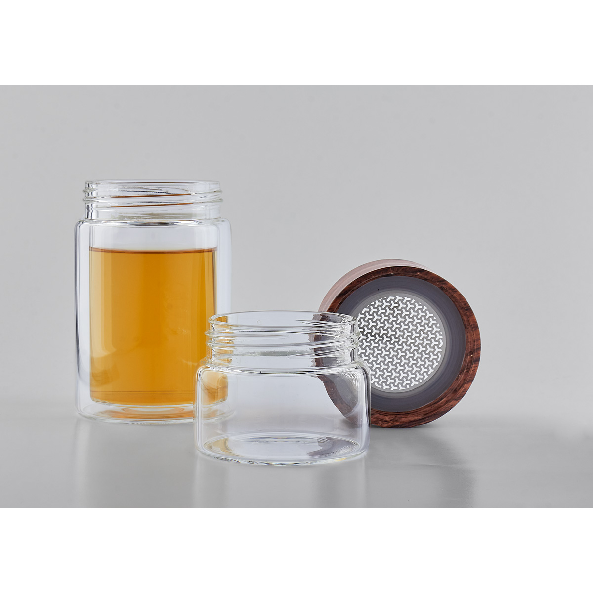 Termo de vidrio de doble pared para bebidas calientes y frias. Tapa de rosca que evita derrames. Contiene una separacion de infusor removible para te de acero inoxidable. Su colador y doble vaso permiten preparar infusiones. Incluye caja individual.