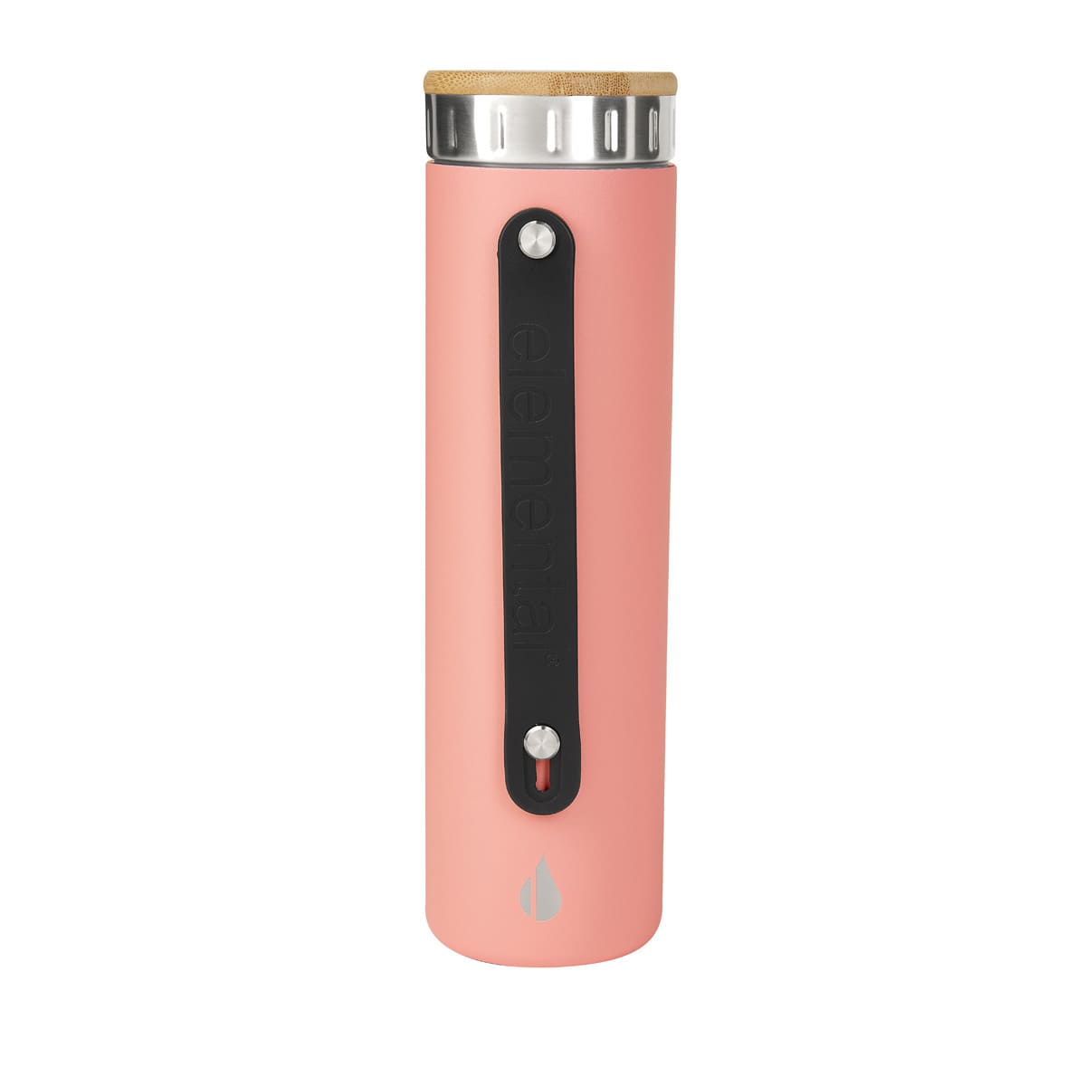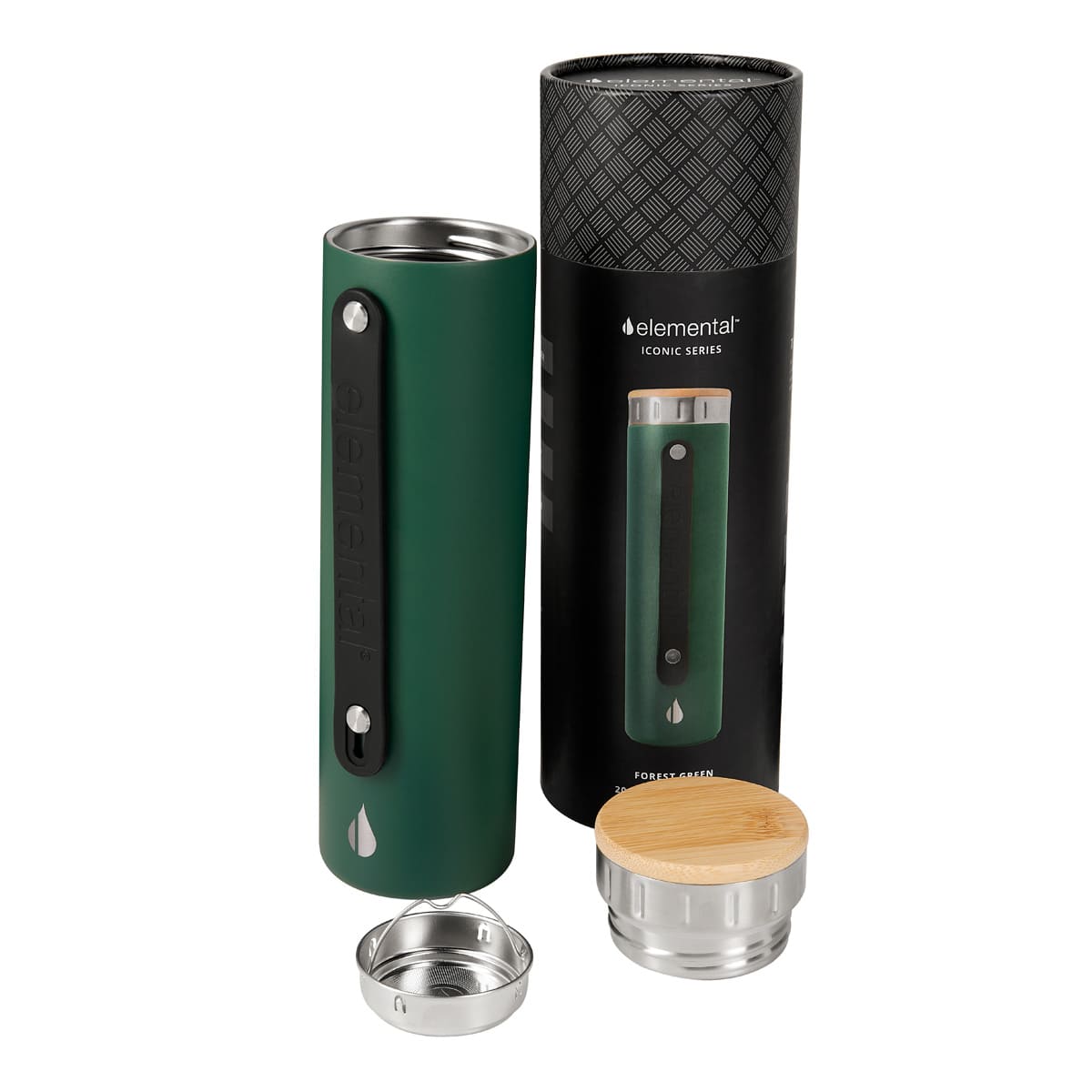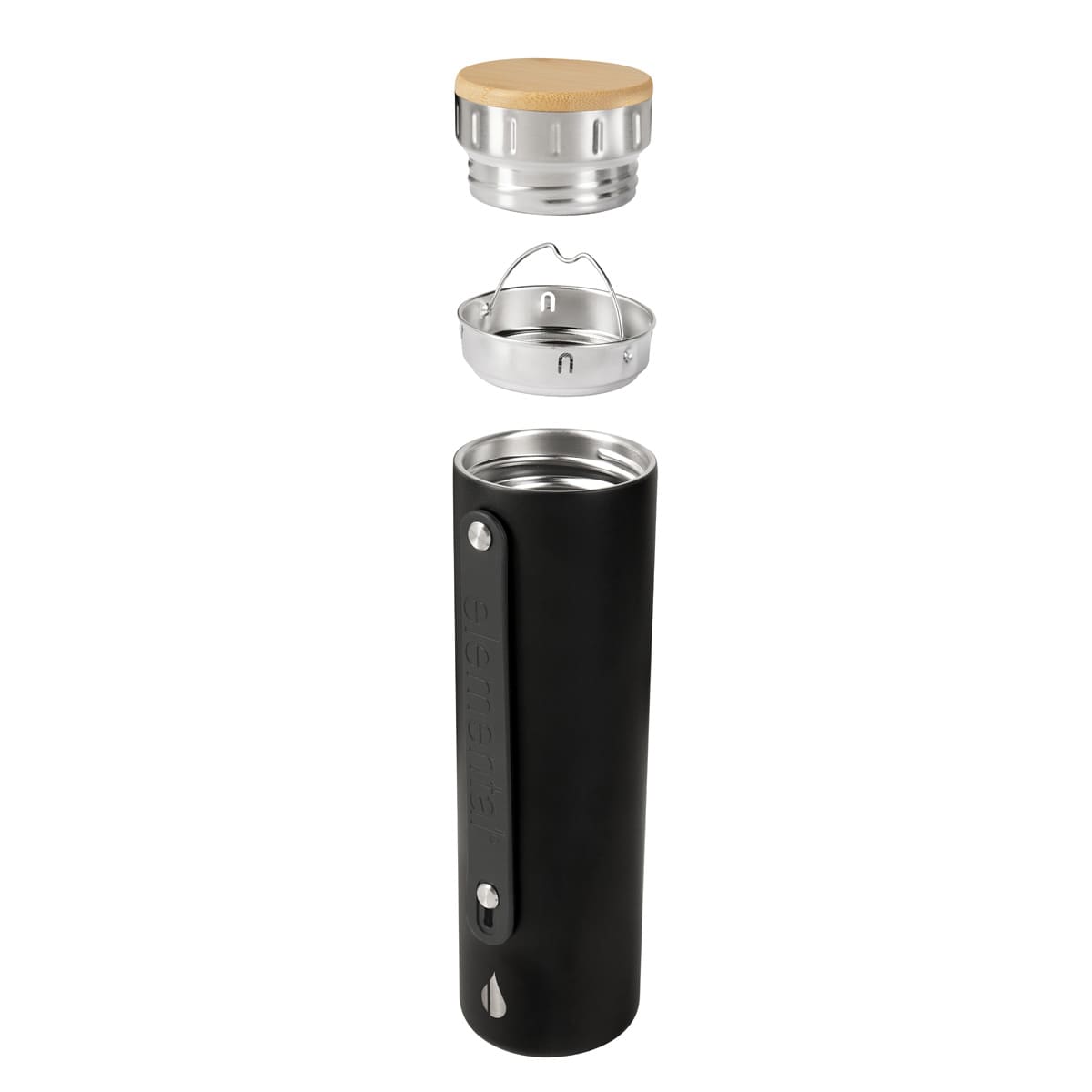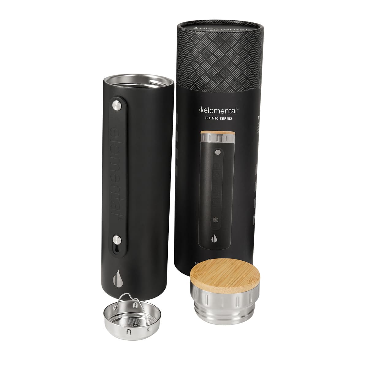 Tecnologia TrueBarrier™ que usa aislamiento de triple pared. Doble pared de acero inoxidable y una capa de revestimiento de cobre. Cerrado al vacio. Material BPA free. Tapa de bambu. Contiene filtro de acero inoxidable. Banda de silicon ajustable y removible. Terminado rugoso. Base antiderrapante. Mantiene temperatura caliente 12 hrs y fria 24 hrs aproximadamente. Incluye caja individual.