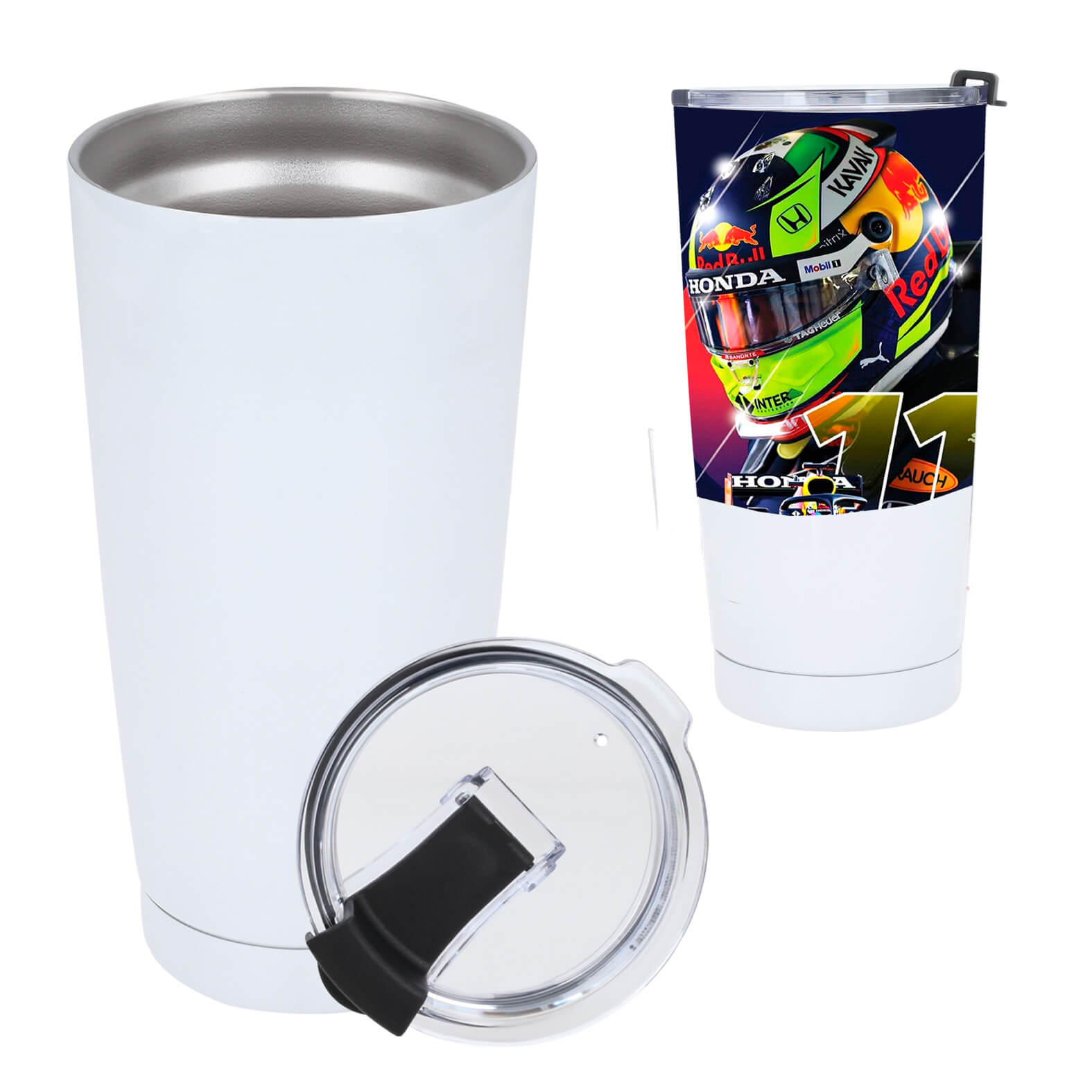 Termo sublimable con doble pared de acero inoxidable insulado al vacío. Incluye tapa de cierre a presión transparente.
