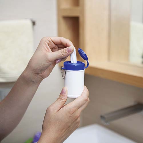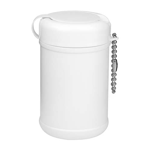 Contiene 30 toallitas humedas. Incluye cadena metalica.