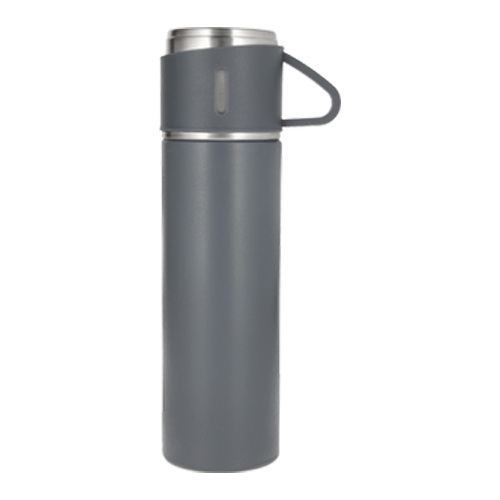 Termo con doble pared de acero inoxidable insulado al vacío. Acabado rugoso y tapa de rosca con asa que se utiliza como taza.