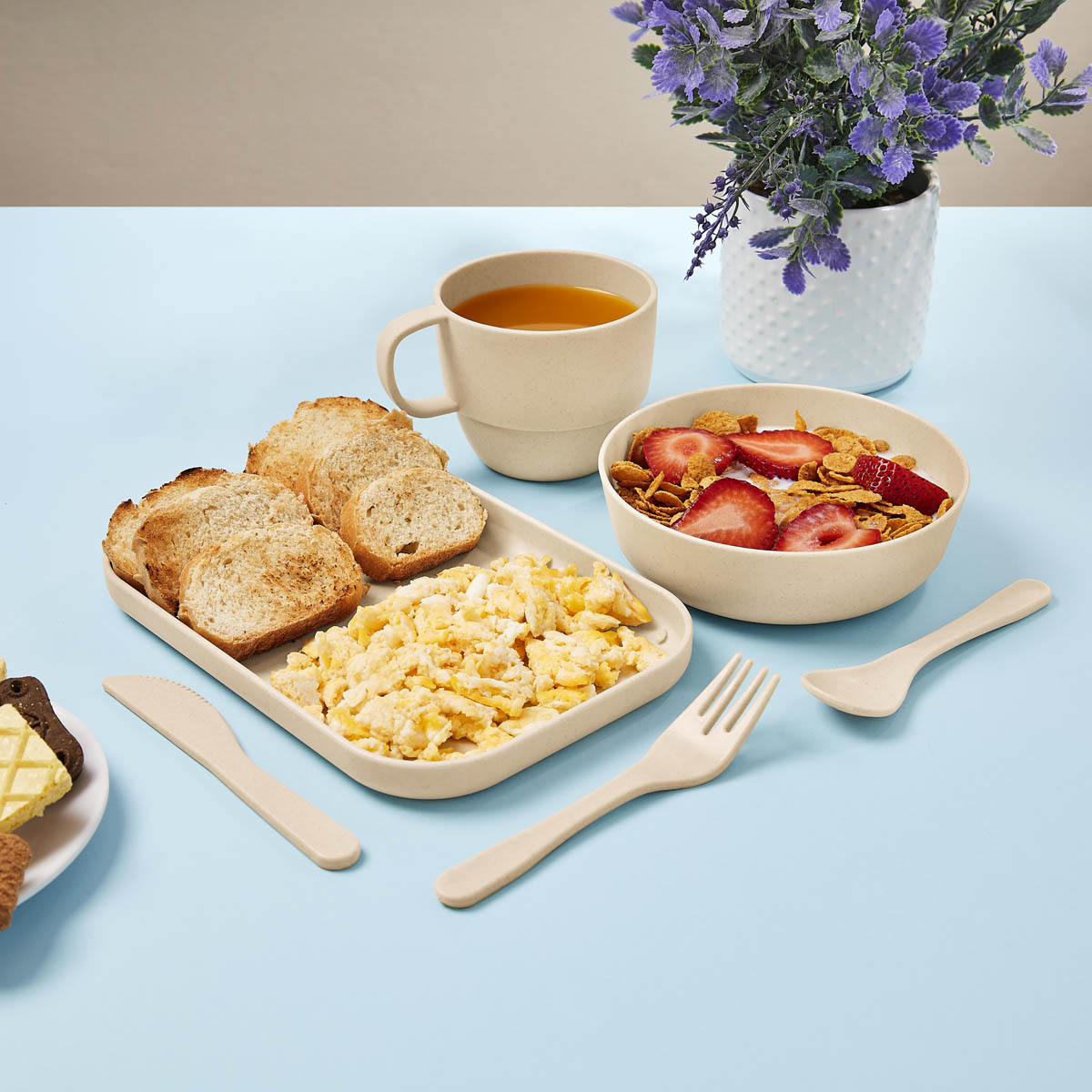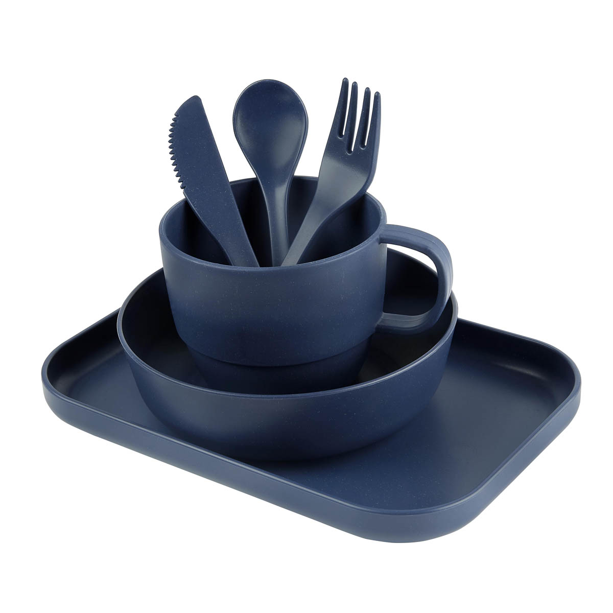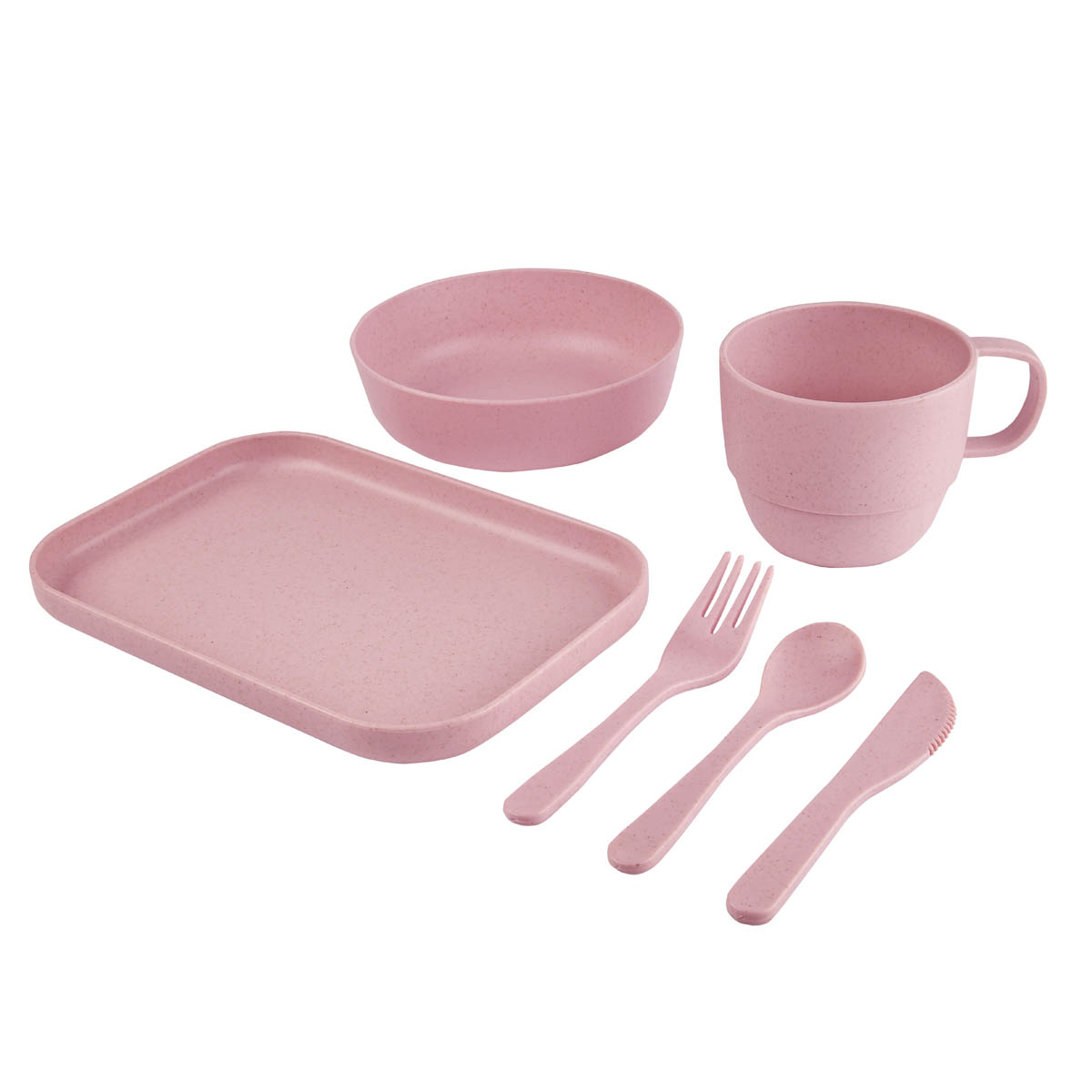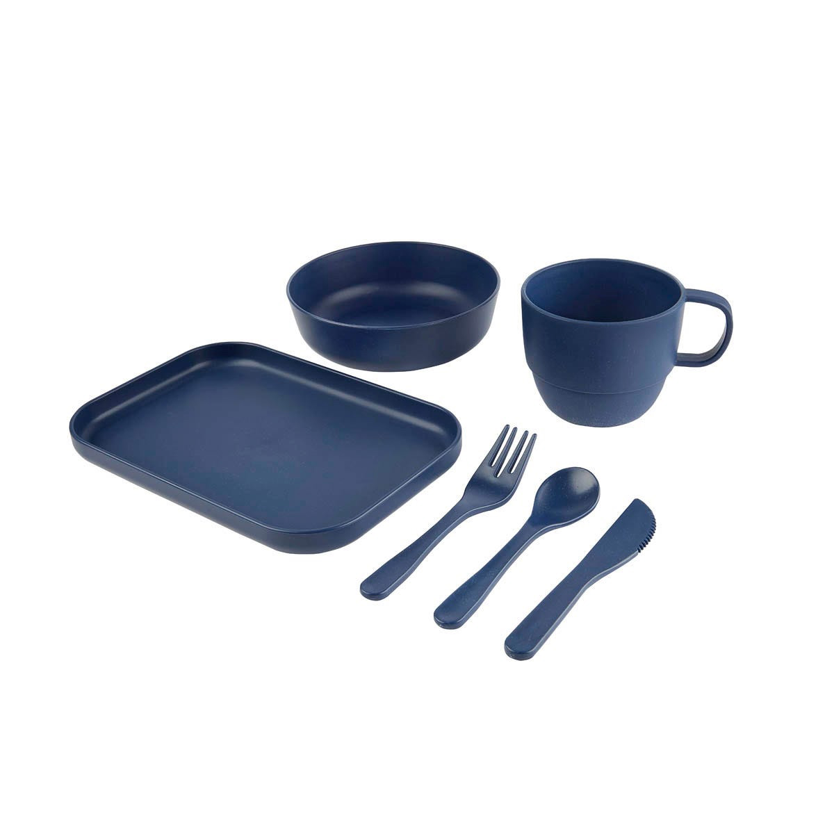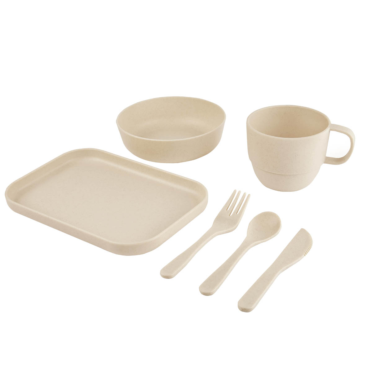 Vajilla de 6 piezas con material eco-friendly. Contiene plato extendido, plato hondo, taza, cuchara, tenedor y cuchillo. Con un diseno atractivo y funcional, es ideal tanto para los mas pequenos como para los adultos, garantizando una experiencia de comida segura y respetuosa con el medio ambiente. Incluye caja individual.