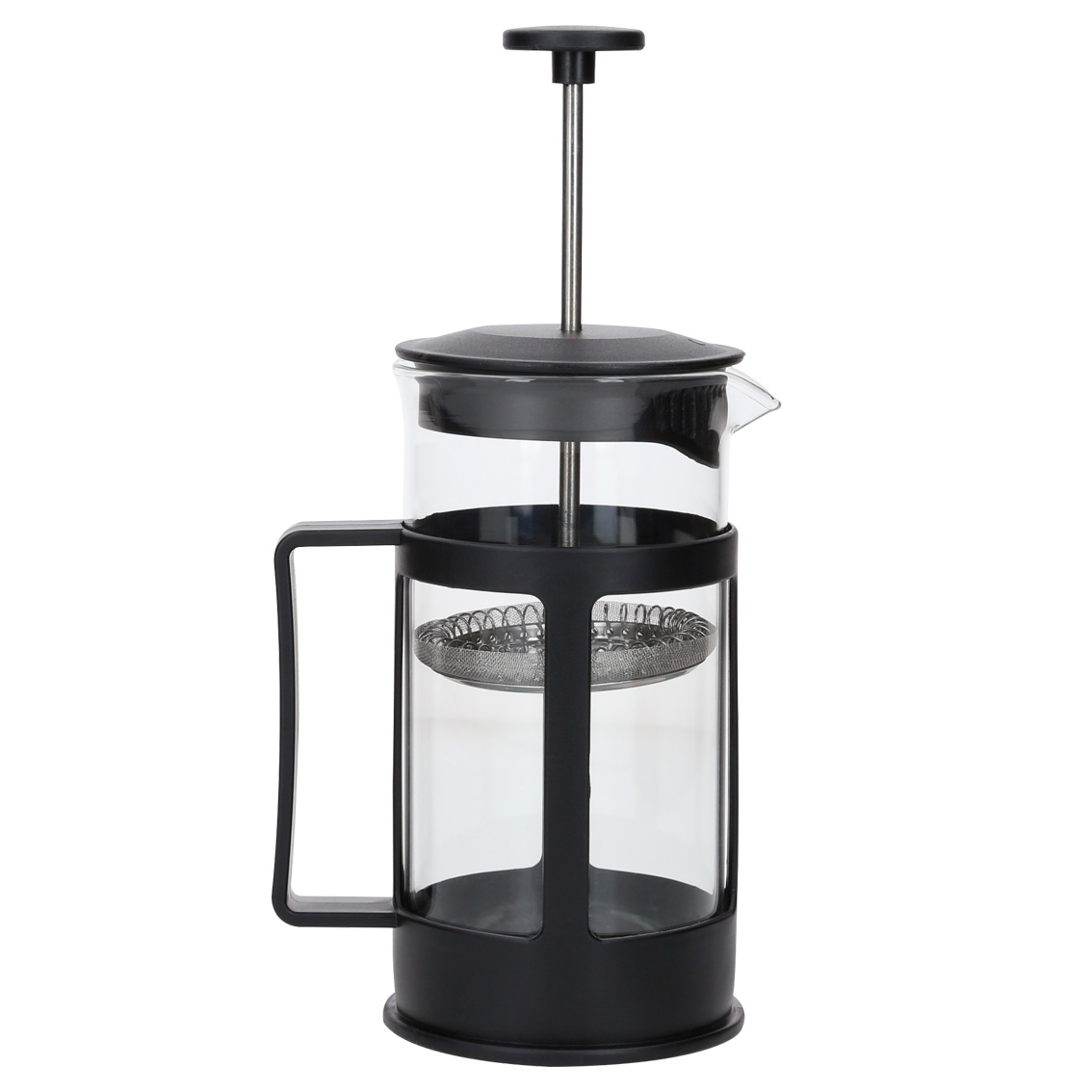 Cafetera de cristal tipo francés con base y tapa de plástico, filtro de acero inoxidable.