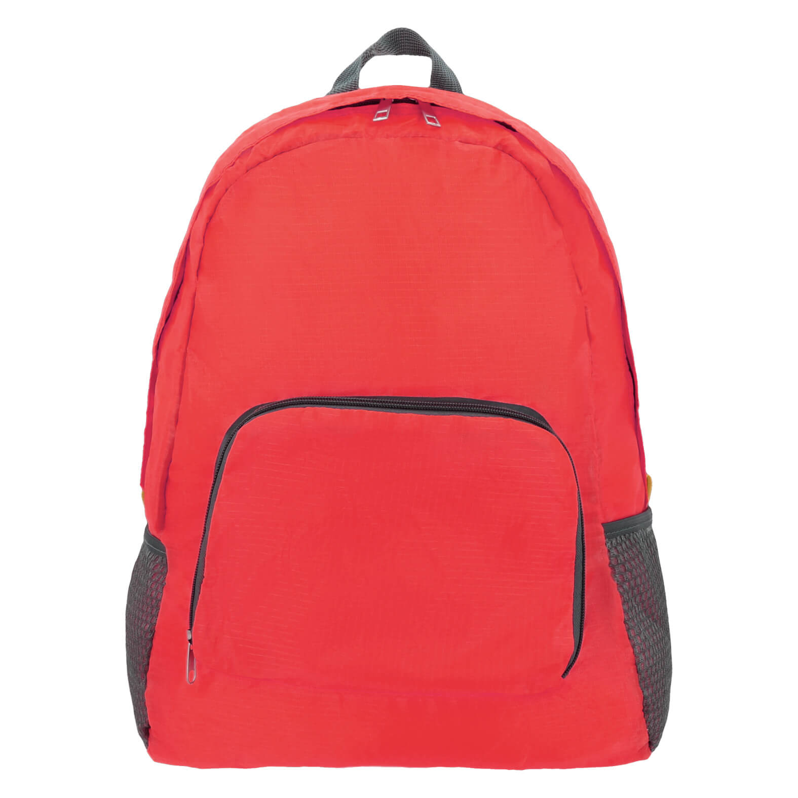 Mochila de 2 compartimentos con cierre y bolsillos laterales de red. Esta mochila se dobla y se convierte en una práctica bolsa para llevar.