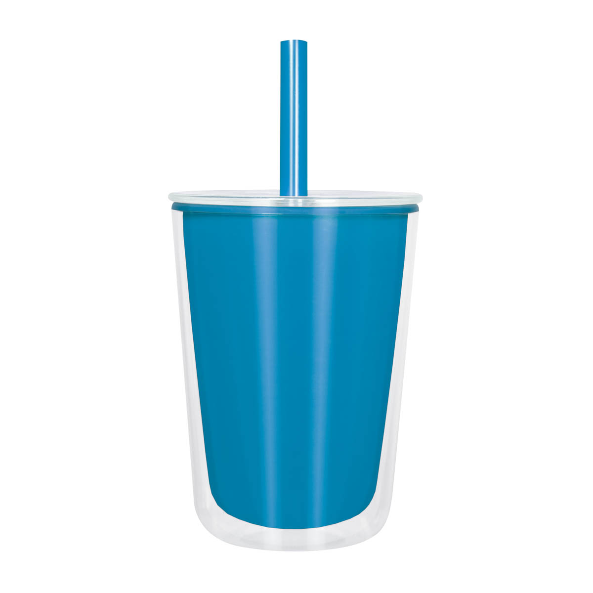 Vaso de plastico doble pared. Su peculiar diseno, cuenta con una pared interna de color y una pared externa transparente, que le da un aspecto moderno y vibrante. La tapa con cierre push y el popote a juego, anaden originalidad a este vaso. Ideal para llevar tus bebidas favoritas a donde vayas. Capacidad de 23 Oz. Base de 9 cm de diametro. Incluye caja individual.