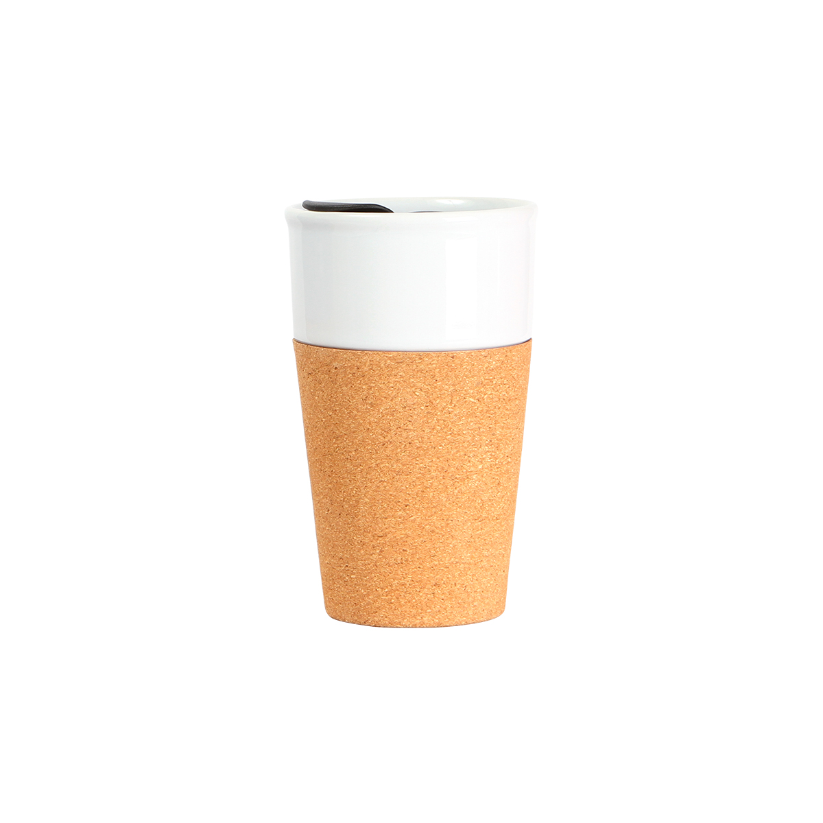 Vaso de color fabricado en cerámica con base de corcho y tapa de polipropileno (PP), tapa con boquilla y pestaña abre fácil . Capacidad de 400 ml.