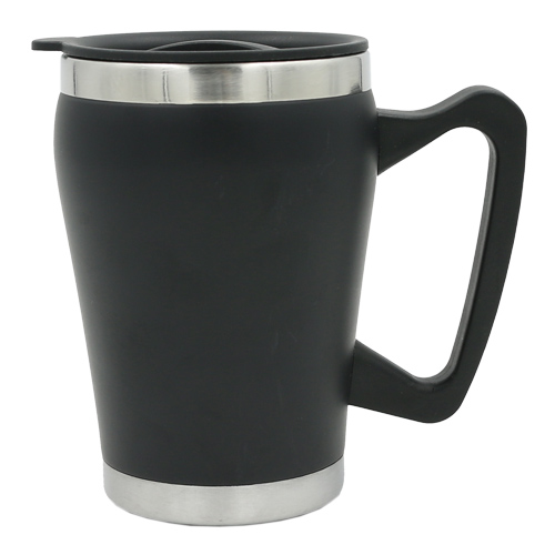 Taza térmica con doble pared de acero inoxidable y asa de plástico.